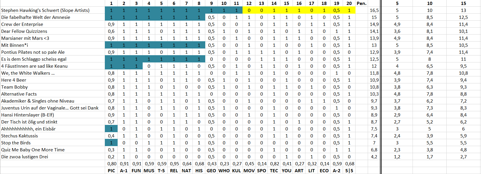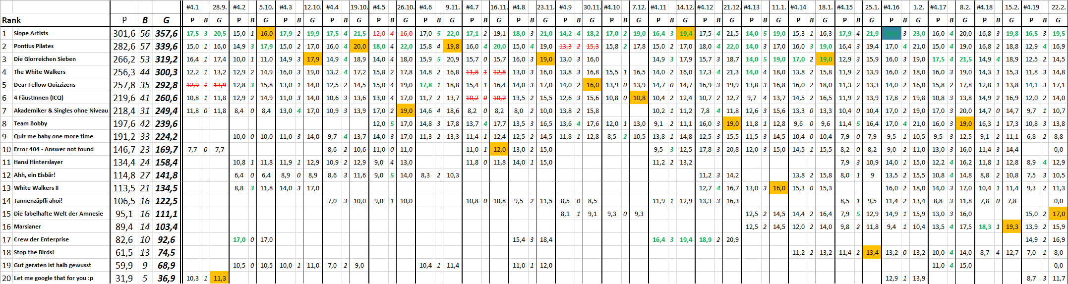 Ergebnis und Zwischenstand in der Quiz-Liga nach 19 Spieltagen: