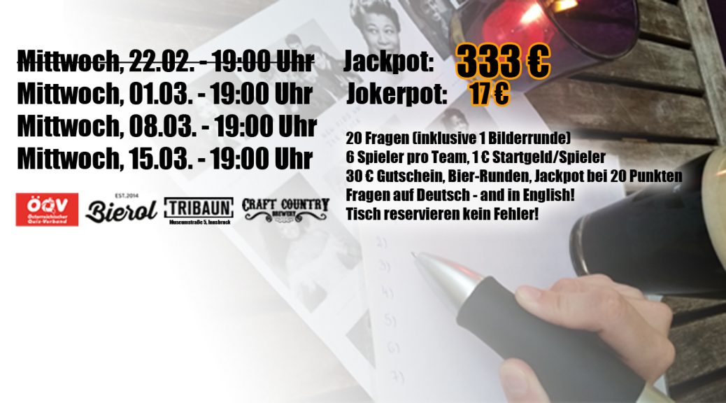 Der Jackpot wurde nicht geknackt und liegt beim nächsten Quiz am 1. März 2017 bei € 333. Der Jokerpot (€ 13) wurde in dieser Woche an das Team auf Platz 2 verlost: "Die fabelhafte Welt der Amnesie". Beim nächsten Mal werden € 17 ausgespielt.