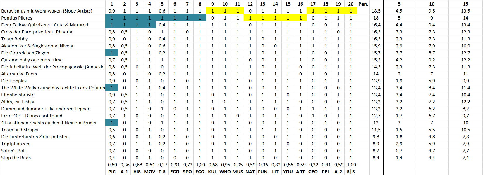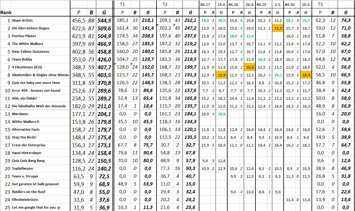 Ergebnis und Zwischenstand in der Quiz-Liga nach 30 Spieltagen: