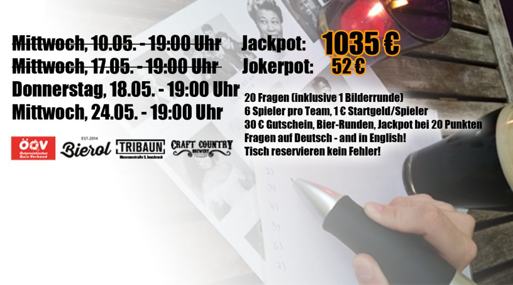 Der Jackpot wurde nicht geknackt und liegt beim nächsten Quiz am 18. Mai 2017 bei € 1.035. Der Jokerpot (€ 49) wurde in dieser Woche an das Team auf Platz 6 verlost: "Akademiker & Singles ohne Niveau". Beim nächsten Mal werden € 51 ausgespielt.