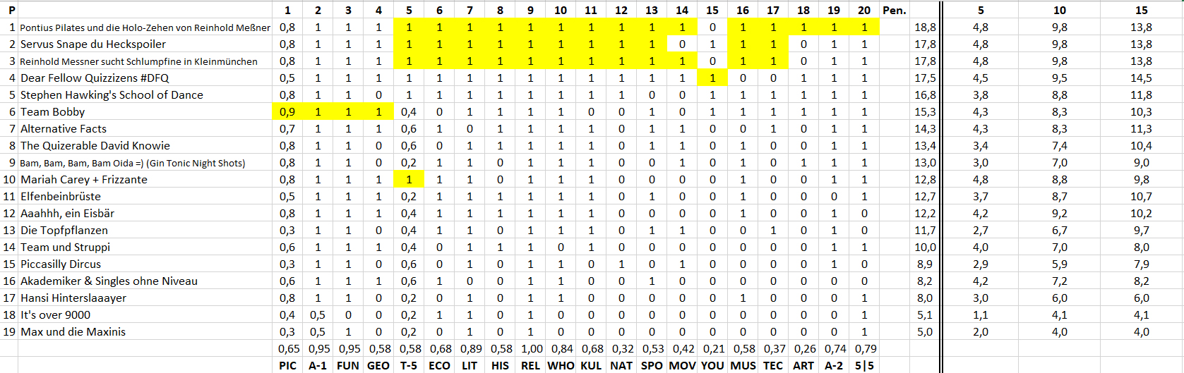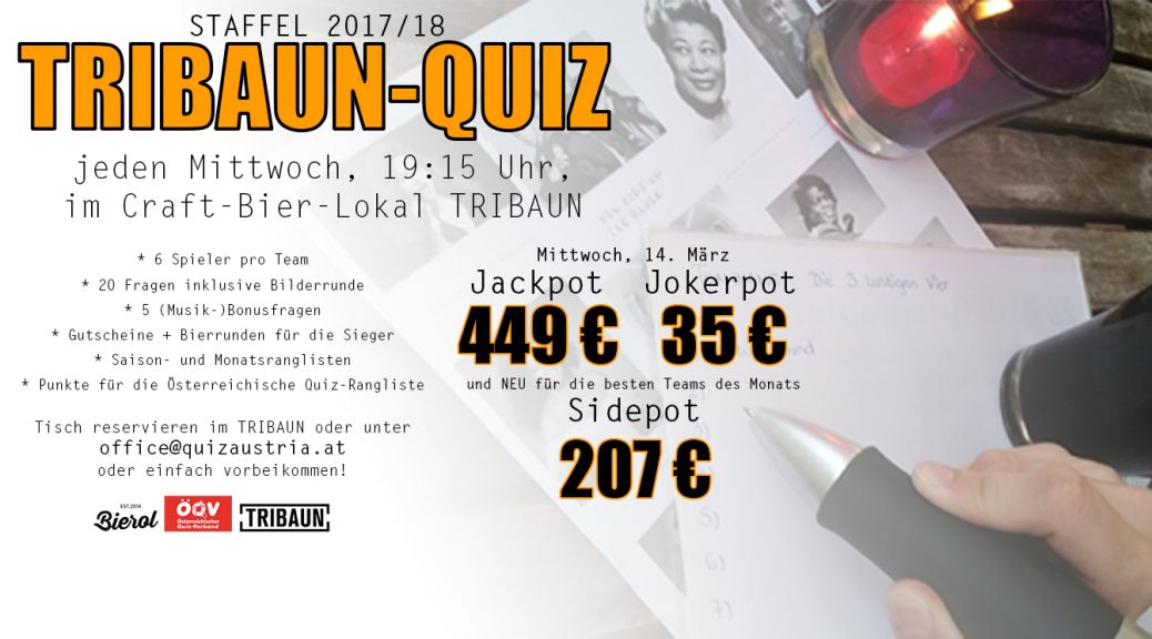 Der Jackpot wurde nicht geknackt und liegt beim nächsten Quiz am 14. März 2018 bei € 449. Der Jokerpot (€ 32) wurde in dieser Woche an das Team auf Platz 1 verlost, Pontius Pilates. Nächste Woche werden € 35 verlost. Im Sidepot für die Monatsrangliste März liegen € 207.