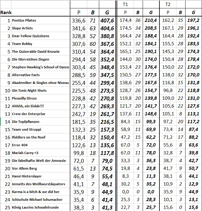 Das Ergebnis des 116. TRIBAUN-Quiz am 7. März 2018, dem 22. der 5. Staffel. Herzlichen Glückwunsch ans Siegerteam: Pontius Pilates!