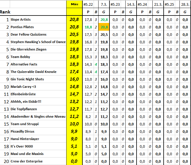 Ergebnis und Zwischenstand in der Quiz-Liga nach 22 Spieltagen und Zwischenstand in der Monatswertung März nach 1 von 4 Spieltagen: