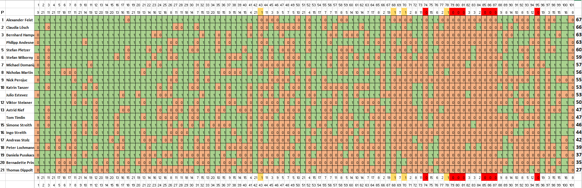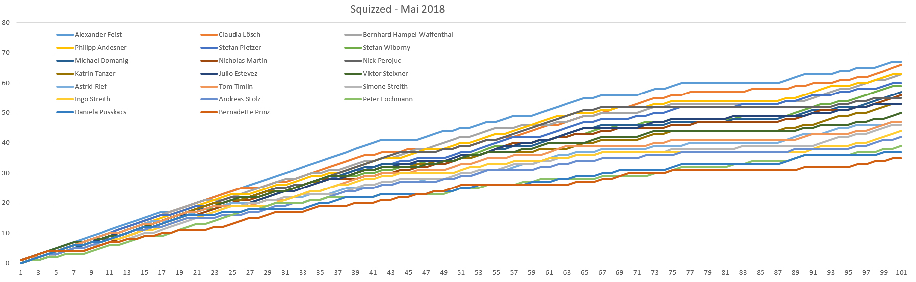 Im neuen Update der Österreichischen Quiz-Rangliste, in dem übrigens die Ergebnisse der Quiz-WM noch nicht berücksichtigt sind, liegt Alex damit mit etwas weniger als 400 Punkten Vorsprung auf Franco Sottopietra in Führung, der aber mit einem starken WM-Ergebnis erstmals das oberste Treppchen erklimmen könnte. In der 2018er-Wertung eroberte Michael Domanig die Führung wieder zurück, weil Claudia Lösch bereits zehn internationale Ergebnisse hat und mit ihrem starken Squizzed-Ergebnis "nur" ein schwächeres Resultat bei einem internationalen Event verdrängen konnte.