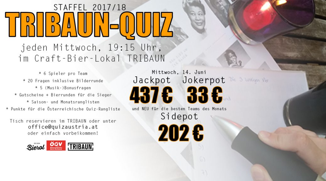 Der Jackpot wurde nicht geknackt und liegt beim übernächsten Quiz am 6. Juni 2018 bei € 437. Der Jokerpot (€ 31) wurde in dieser Woche an das Team auf Platz 6 verlost, The Quizerable David Knowie. Nächste Woche gehen € 33 an ein Team aus den Top 15. Im Sidepot für die Monatsrangliste Juni liegen € 202.