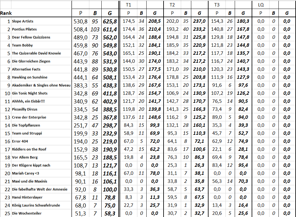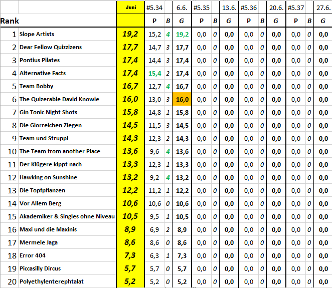Ergebnis und Zwischenstand in der Quiz-Liga nach 34 Spieltagen und Zwischenstand in der Monatswertung Juni nach 1 von 4 Spieltagen: