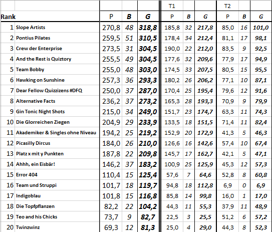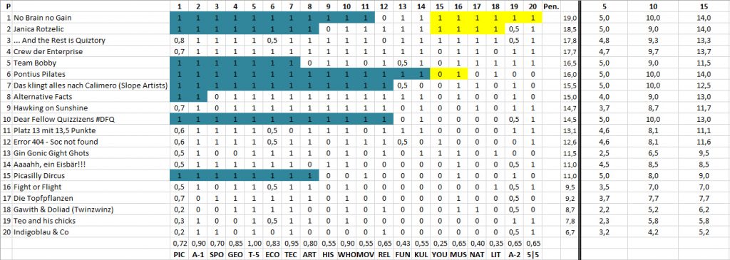 Das Ergebnis des 162. TRIBAUN-Quiz am 6. Februar 2019, dem 17. der 6. Staffel. Herzlichen Glückwunsch ans Siegerteam: No Brain, no Gain!