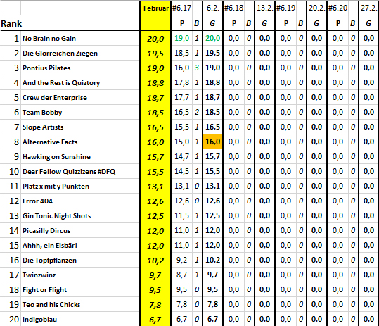 Ergebnis und Zwischenstand in der Quiz-Liga nach 17 Spieltagen und Endstand in der Monatswertung Februar nach 1 von 4 Spieltagen: