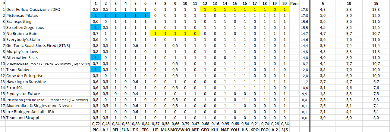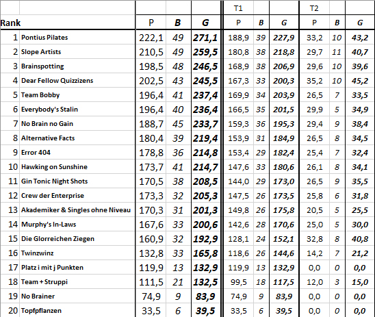 Für Februar dank Teilnahme an mindestens einem Jänner-Quiz fix qualifizierte Teams (17): Slope Artists, Pontius Pilates, Everybody's Stalin, Crew der Enterprise, Akademiker & Singles ohne Niveau, Dear Fellow Quizzizens, Alternative Facts, No Brain no Gain, Brainspotting, Twinzwinz, Gin Tonic Night Shots, Error 404, Team Bobby, Murphy's in-laws, Hawking on Sunshine, Team + Struppi, Die Glorreichen Ziegen