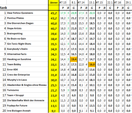Ergebnis und Zwischenstand in der Quiz-Liga nach 14 Spieltagen und Zwischenstand in der Monatswertung Jänner nach 2 von 4 Spieltagen: