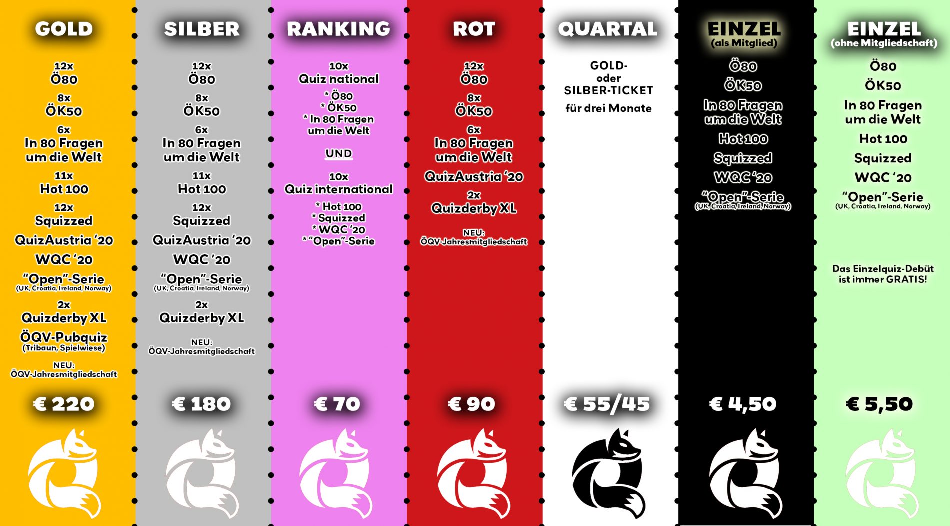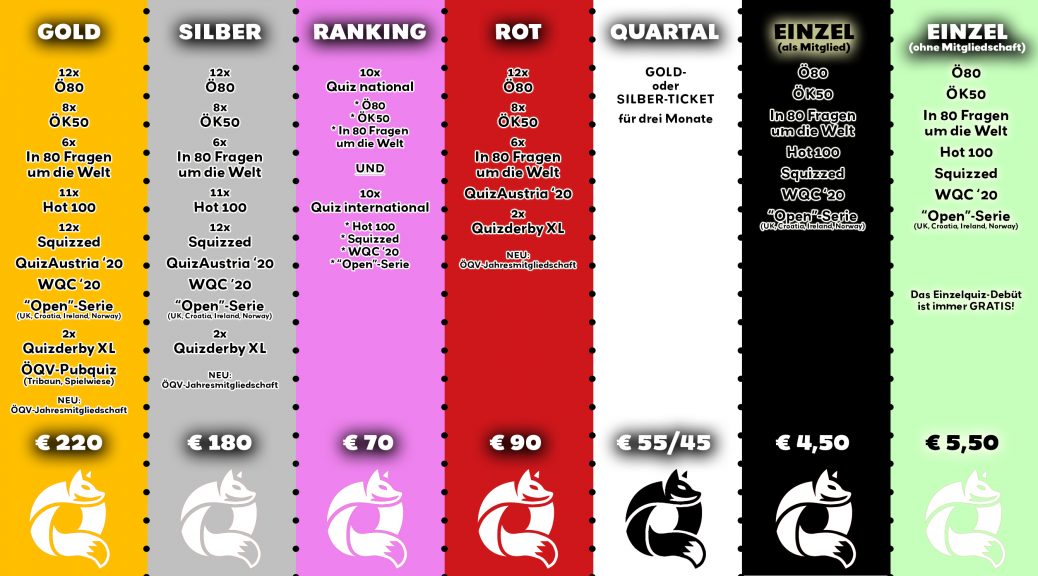 Die Tickets in den Varianten "GOLD", "SILBER", "RANKING", "ROT", oder "QUARTAL" werden für 2020 neu aufgelegt. Neu im Vergleich zum Vorjahr hinzugekommen ist die inkludierte ÖQV-Jahresmitgliedschaft im Wert von € 15. Dazu erscheinen die "80 Fragen um die Welt" sechs Mal im Jahr statt bisher vier Mal. Vor allem den Einzel-Vielquizzern, aber auch interessierten Einsteigern macht der Österreichische Quiz-Verband damit ein attraktives Angebot für ein Jahr Quiz-Vergnügen ohne ständigem "Münznachwurf".