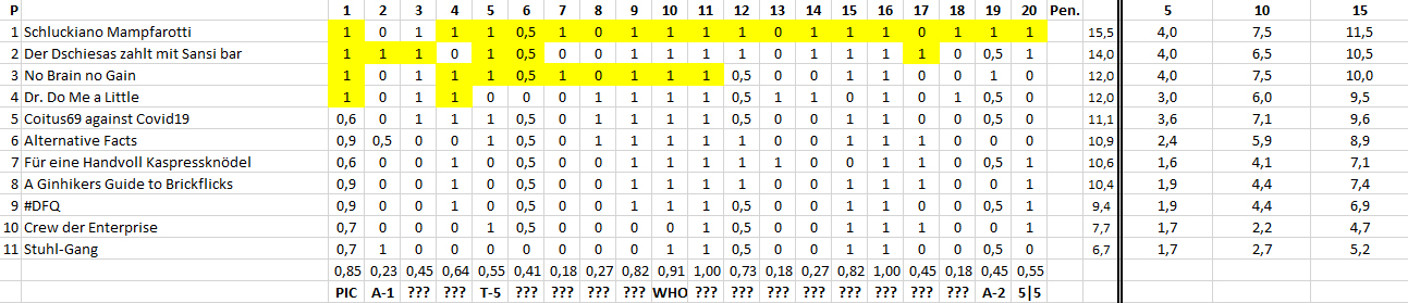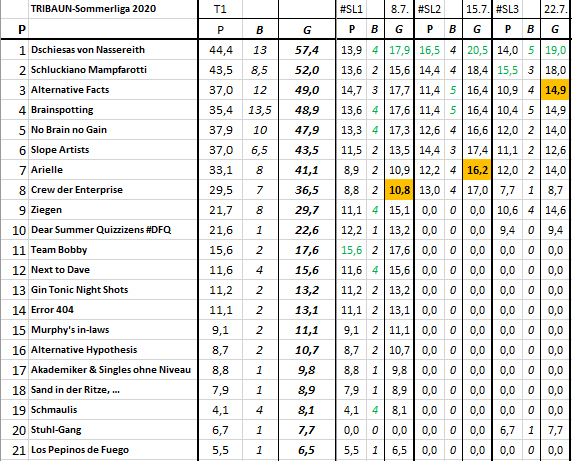 Das Ergebnis des 225. TRIBAUN-Quiz am 5. August, dem 3. der Sommerliga 2020, gestaltet und geleitet von Pascal und Mario. Herzlichen Glückwunsch ans Siegerteam: Schluckiano Mampfarotti!