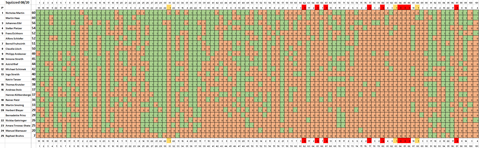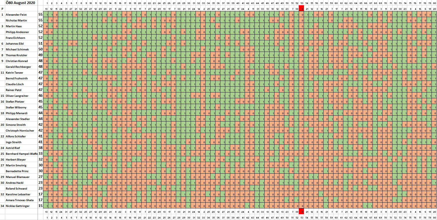 Vor einer Woche hatten wir den Sieg von Alex Feist in der Österreich-Wertung von "In 80 Fragen um die Welt" und Nicholas Martins Erfolg bei den Hot 100 verkündet. In dieser Woche legen Alex und Nicholas mit dem gemeinsamen Erfolg bei den Ö80 im August nach. Martin Haas vervollständigt das Podest - gemeinsam mit Philipp Andesner und Franz Eichhorn - als Dritter. Außerdem erzielten Nicholas und Martin die höchsten Werte bei Squizzed. Hier landete Johannes Eibl auf Rang drei.